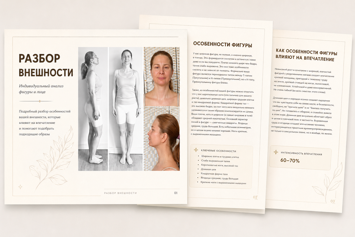 Вы получаете текстовый документ с полным анализом вашей внешности, изучаете его, формулируете вопросы и мы назначаем дату созвона, где обсуждаем вашу ситуацию, цели и пути решения.